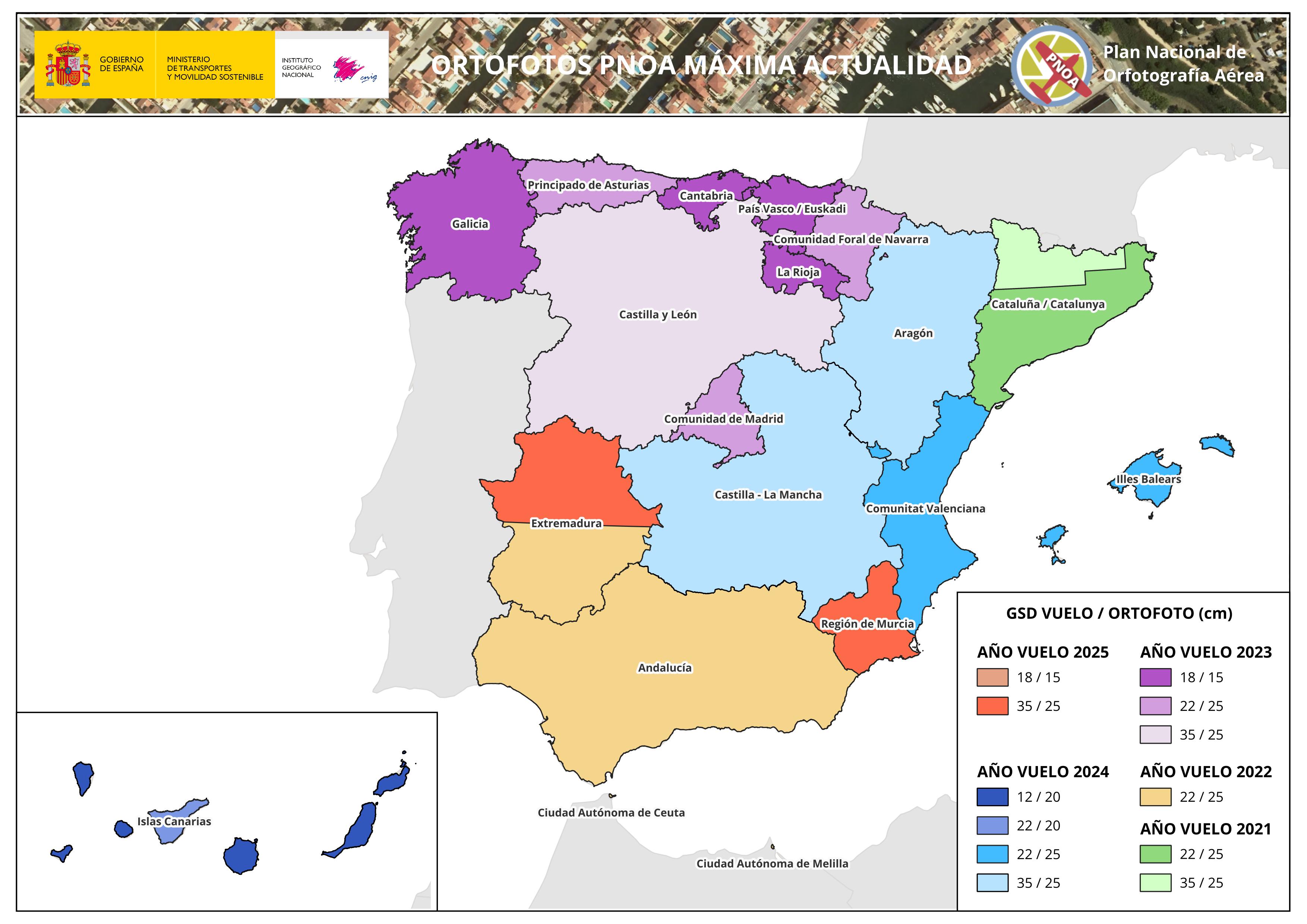 Las ortofotos de máxima actualidad son los mosaicos de ortofotos definitivas más recientes obtenidos para todo el territorio nacional, y se distribuyen según cortes de hoja oficial a escala 1:25.000 en formato comprimido COG.