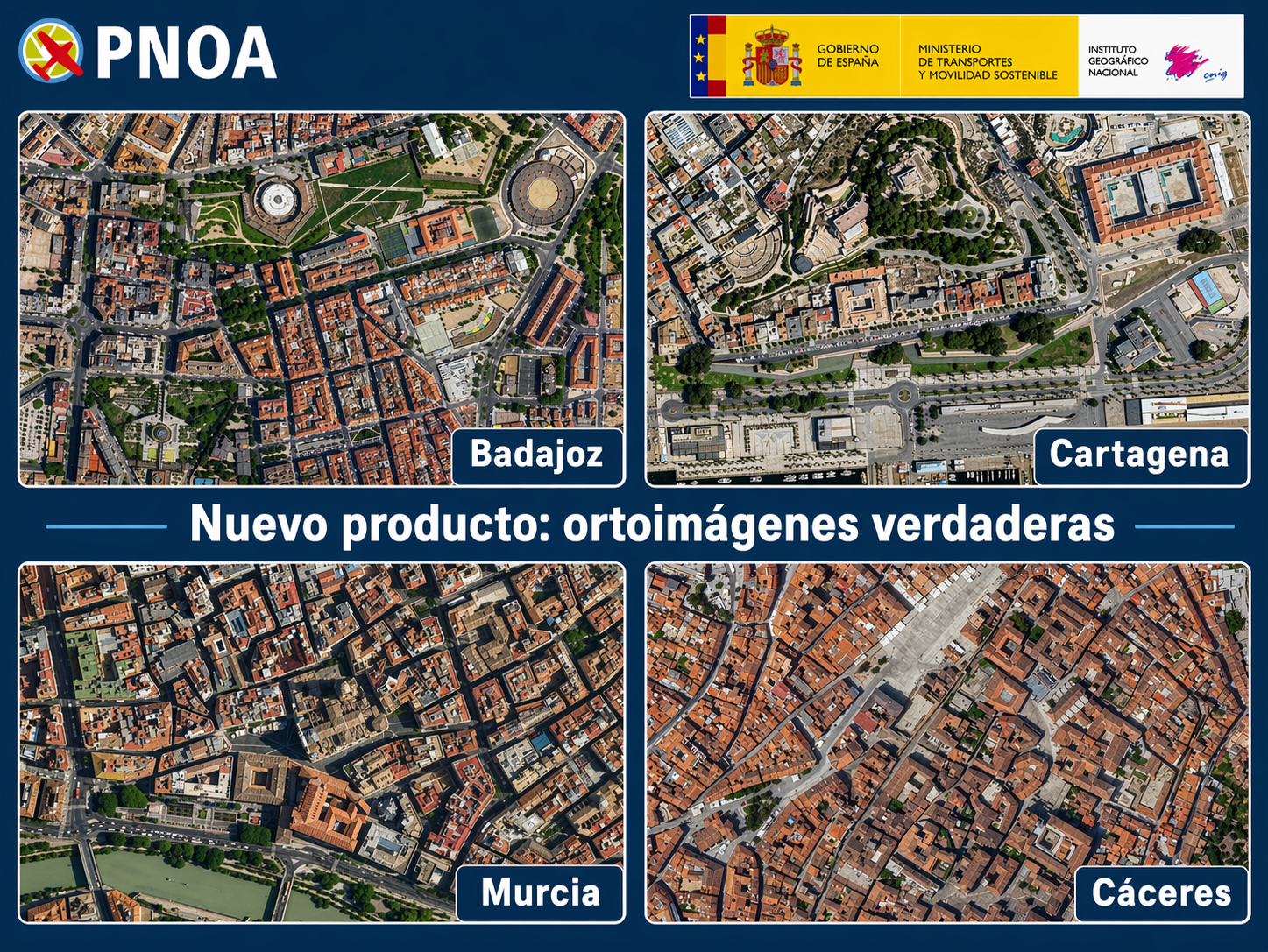 El Plan Nacional de Ortofotografía Aérea (PNOA) ha publicado un nuevo producto: las ortoimágenes verdaderas de los núcleos urbanos de Badajoz, Cáceres, Murcia y Cartagena. Estos datos ya están disponibles para su descarga a través del Centro de Descargas del CNIG en formato COG, y para su visualización a través de los servicios web WMS, WMTS y TMS.