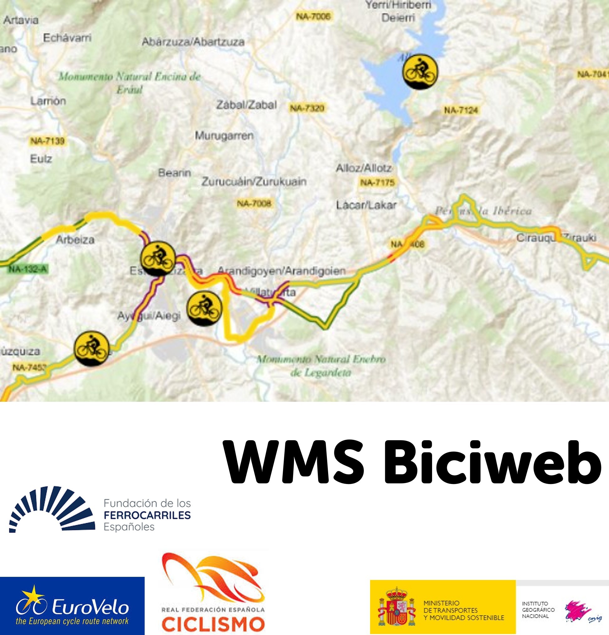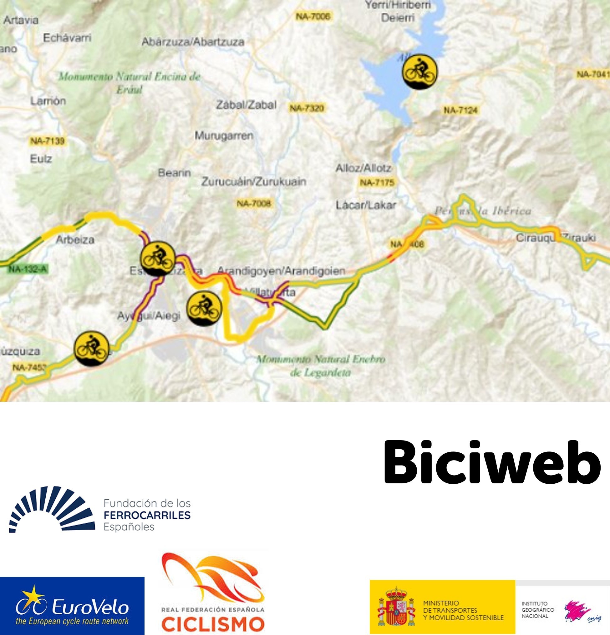 Etapas ciclables contenidas en el portal de rutas ciclistas por España spainbybike.es. Además contiene puertos de montaña y espacios geográficas acondicionados y señalizados para la práctica del ciclismo de montaña (BTT = Bicicleta Todo Terreno). Para la obtención de estos datos han participado las siguientes organizaciones: Ministerio de Agricultura, Pesca y Alimentación como gestor y responsable de la inversión del Programa de Caminos Naturales; el de la Fundación de los Ferrocarriles Españoles, F. S. P. como entidad que promueve y dinamiza el programa Vías Verdes; el de ConBici como secretaría técnica del Centro de Coordinación EuroVelo en España. Asimismo, la Real Federación Española de Ciclismo (RFEC) ha desempeñado la tarea fundamental de la evaluación técnica de las rutas. Finalmente, la herramienta informática y los trabajos cartográficos son desempeñados por el Centro Nacional de Información Geográfica (CNIG).