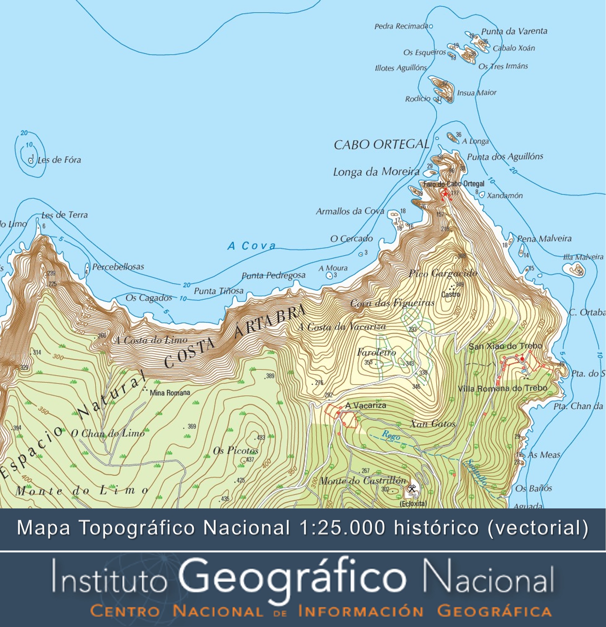 Cartografía vectorial de las ediciones históricas digitales del Mapa Topográfico Nacional a escala 1:25.000 de España. La estructura del nombre de cada fichero es la siguiente w0288c3_31_02_2013.pdf, sería el cuarto 3 de la hoja 0288 en ETRS89), la primera letra se corresponde con el Sistema Geodésico de Referencia, «w» para ETRS89, «h» y «m» para ED50 y «a» para hojas de mapa automático con edición simplificada en ETRS89. A continuación figura el número de la hoja y su cuarto, en este caso sería el cuarto 3 de la hoja 0288 en ETRS89), después el huso en el que se encuentra la hoja (31), el número de edición (02) y a continuación el año de edición (2013). Los ficheros sobre los que se han resuelto incidencias, sin modificar la edición impresa, se nombran añadiendo el número de incidencia. Por ejm. w0288-3_31_0201_2013 se corresponde con la 1º incidencia de la 2º edición de la hoja 0288, cuarto 3 y dicha incidencia fue resuelta en el año 2013.
