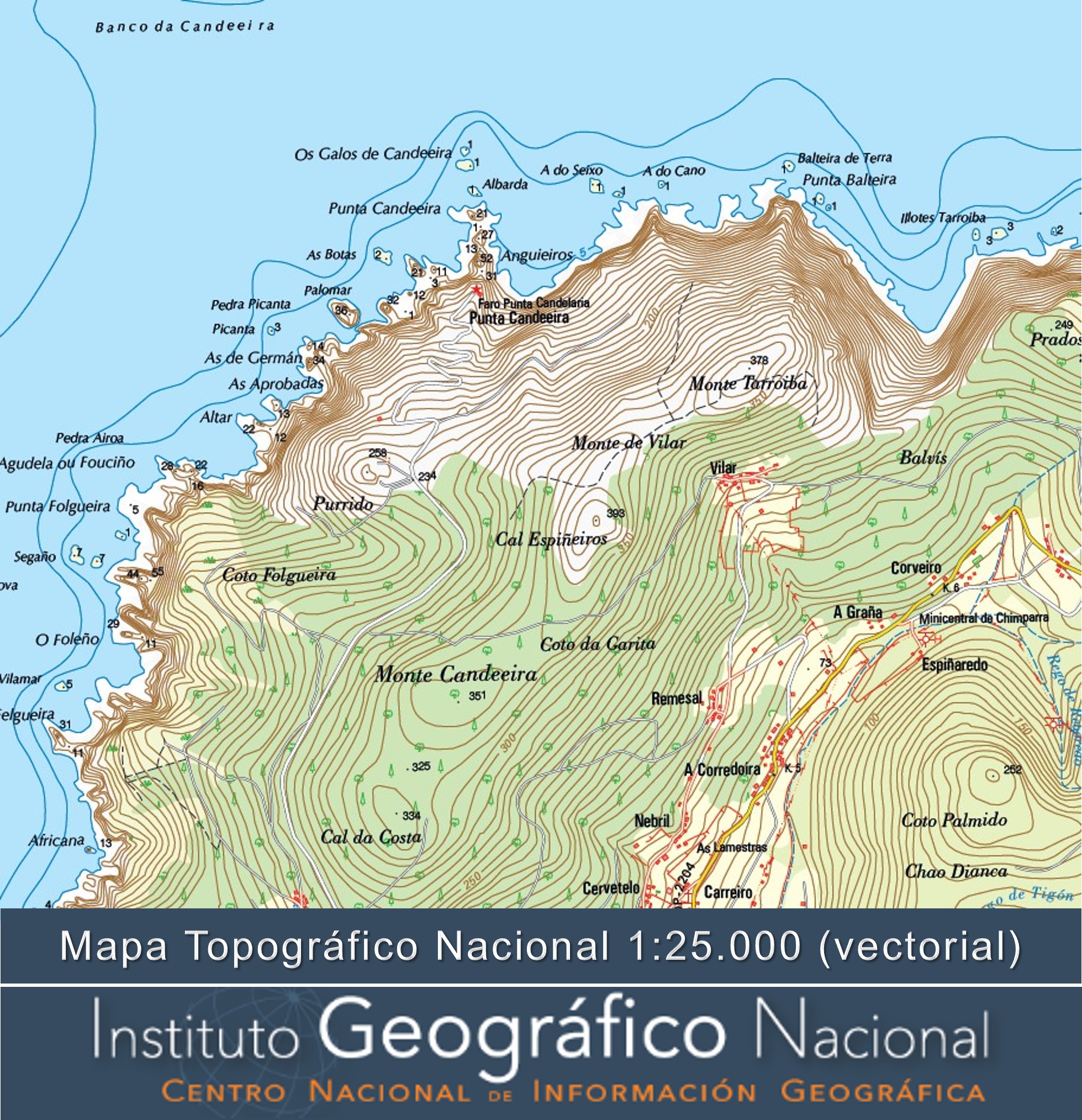 Cartografía vectorial del Mapa Topográfico Nacional a escala 1:25.000 de España,generada de forma automática a partir de la información de la Base Topográfica Nacional BTN y de la incorporación de las Líneas límite municipales,vértices geodésicos, SIOSE y sombreado, con un proceso adicional de edición simplificada.Se corresponde con las últimas ediciones publicadas en papel, la única diferencia es que en estas últimas también se añade información de exteriores como el marco, portada, contraportada, tabla de signos convencionales y leyenda.