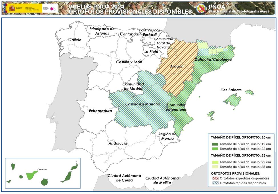 Con esta actualización se publican las ortofotos PNOA Máxima Actualidad de los vuelos realizados en 2024 correspondientes al lote de las Islas Canarias. En los próximos meses, se irán incorporando el resto de las ortofotos de las zonas voladas entre los meses de mayo y septiembre 2024, que incluyen Cataluña costa, Cataluña interior y Comunidad Valenciana.
